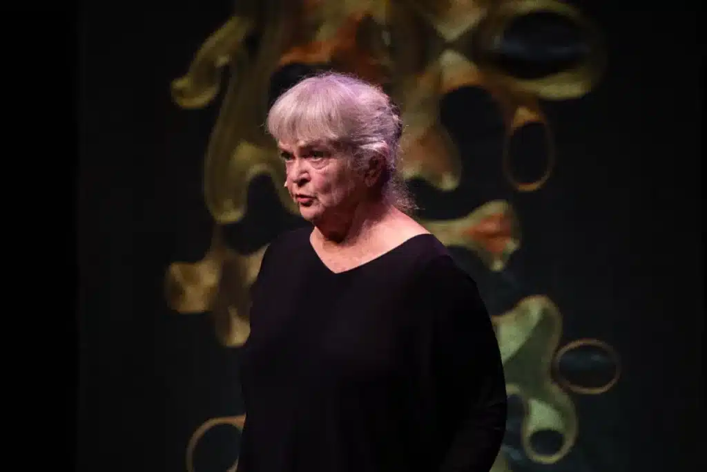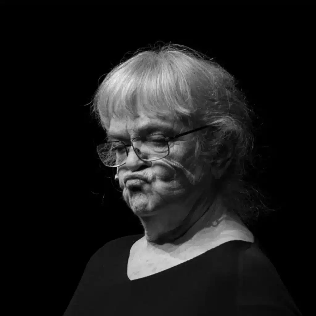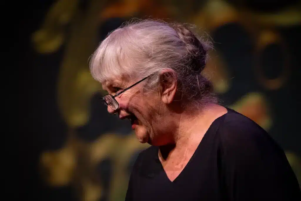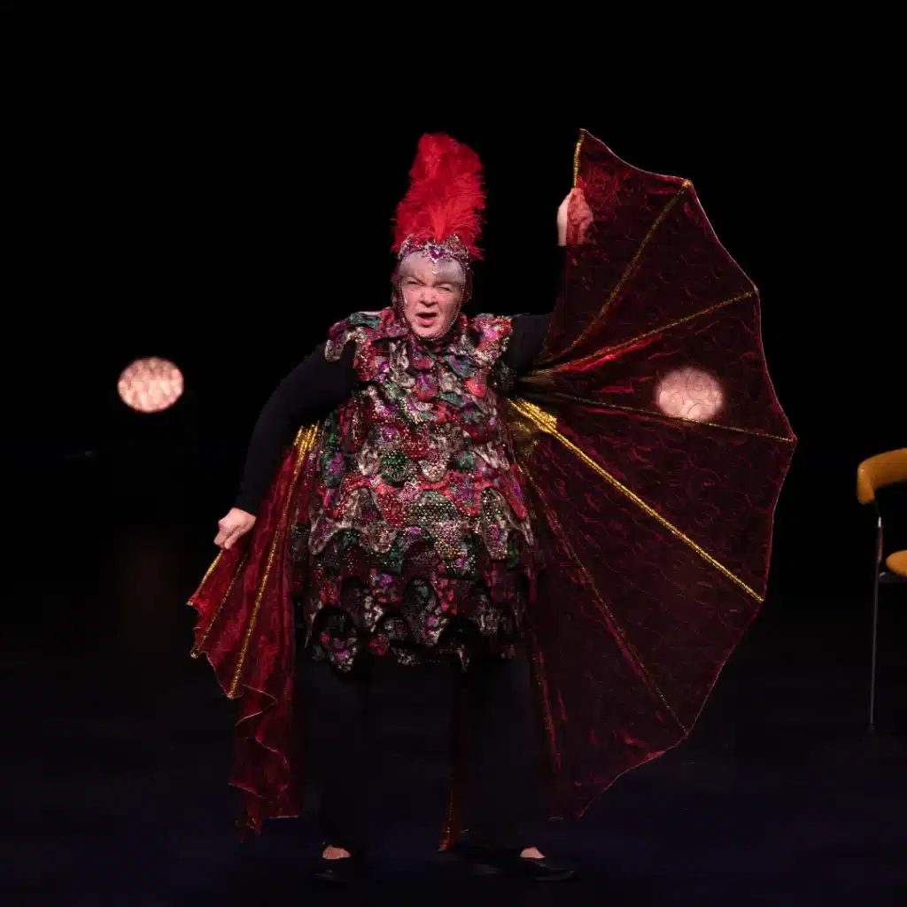 Hun blir aldri lei av å date sitt publikum. Byr på mer enn seg selv i hyper tilstedeværelse og vilje til å overraske og glede med sine absurde innfall og store alvor. Hun stiller seg selv spørsmål om alt fra grus til gras, og kanskje har du også noe å spørre om? Det er lov. Det er ikke bare lerka som jubler høyt. Gamle sprukne røster har også livets rett, så her kan det meste skje.
